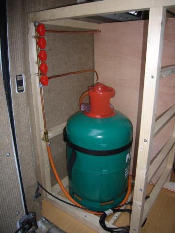 Installed a standard patio heater sized propane cylinder in a cupboard behind the kitchen area, accessible from the rear doors. Should last for ages! Fitted a set of isolation valves to independently control gas to each appliance.