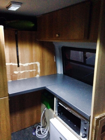 Wardrobe, worktops, fridge, grill and splash back are all now installed.
