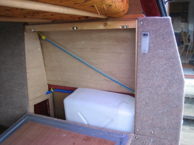 Water tank fitted into cupboards at the back of the van. Strapped in by a bungee to stop it rattling. A submersible pump in the tank is wired in and activates when the sink tap is turned on pumping water through the blue water piping to the sink. Although at the back of the van and therefore away from the sink this was so we could get access to it easily to refill it. Also you can check the level by opening the side cupboard panel.